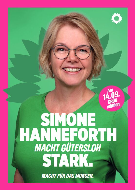 3. Simone Hanneforth Simone Hanneforth kandidiert auf Listenplatz 3 für den Wahlkreis 11 (Grundschule Pavenstädt).Liebe Wählerinnen und Wähler,ich bin Ihre Grüne Kandidatin im Wahlbezirk 11/ Pavenstädt.In Zeiten von Kriegen und Krisen sind starke demokratische Kräfte und gesellschaftlicher Zusammenhalt wichtig, und es braucht Menschen, die sich couragiert für andere einsetzen.Seit 5 Jahren bin ich Ratsfrau in Gütersloh. Ich trete mit der Grünen Fraktion in Stadt und Kreis für ein tolerantes und solidarisches Miteinander ein. Junge Menschen brauchen klare Zukunftsperspektiven. Kultur braucht Demokratie und Freiheit mehr denn je.Ich trete an fürbezahlbare Wohn- und Lebensbedingungeneine verlässliche GesundheitsversorgungSchutz vor häuslicher Gewalt und vor Armuteine bunte Zukunft der Weberei Güterslohden Erhalt von Jugend- und Kulturräumenzukunftsorientierte Ausbildung auch im HandwerkHitzeschutz durch Baumerhalt und NeupflanzungenGleichstellung und ChancengleichheitDanke für Ihr Vertrauen und Ihre Stimme für mich und Bündnis90/DIE GRÜNEN bei der Kommunalwahl am 14. September.KontaktInstagramHier können Sie sich über die anstehende Kommunalwahl 2025 in Gütersloh informieren.Zur Interaktiven WahlkarteSie möchten mehr über unser Wahlprogramm und die Kandidat:innen erfahren? Hier geht’s zur Übersicht. Kommunalwahl 2025