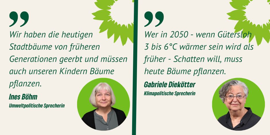 Aus dem Ausschuss für Umwelt und Klimaschutz 27. Oktober 202528. Oktober 2025 Im letzten Ausschuss für Umwelt- und Klimaschutz haben wir Fragen zur Baumpflege und Nachpflanzungen von Straßenbäume gestellt.Zitat unserer klimapolitischen Sprecherin Gabriele Diekötter aus dem Ausschuss: „Wer in 2050 – wenn Gütersloh 3 bis 6°C wärmer sein wird als früher – Schatten will, muss heute Bäume pflanzen.“Zudem hat unsere umweltpolitischen Sprecherin Ines Böhm besonders darauf hingewiesen, dass die heutigen Stadtbäume von früheren Generationen gepflanzt wurden und wir jetzt die Aufgabe haben dies für unsere Kinder und Enkelkinder zu tun.Bäume sind unverzichtbar für ein gutes Stadtklima. Der Bedarf, besonders an den Klimawandel angepasster Bäume, wird sogar noch steigen.