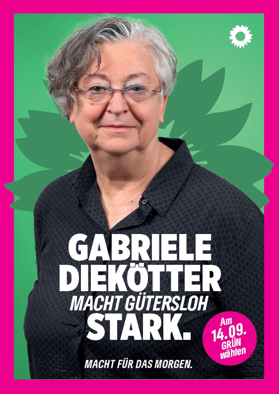 Wahlbezirk 12 – Gabriele Diekötter Gabriele Diekötter kandidiert für den Wahlkreis 12 (ash Gütersloh gGmbH).Liebe Wählerinnen und Wähler,seit vielen Jahren setze ich mich aus Überzeugung für Grüne Politik im Rat der Stadt Gütersloh ein. Die fortschreitende Klimakrise werden wir nur aufhalten, wenn wir heute entschlossen handeln und Schritt für Schritt den Ausstieg aus allen fossilen Energieträgern voranbringen.Dazu brauchen wir:eine Wärmeversorgung aus erneuerbare EnergienGebäude mit geringem Energieverbrauchattraktiven und sicheren Radverkehr für alleein gutes und bezahlbares Bussystemdie Reaktivierung der TWENur mit sozialer Gerechtigkeit und einer offenen Gesellschaft können wir unsere Demokratie stärken.Dazu brauchen wir:bezahlbaren Wohnraum für allegleiche Chancen für alle Kindergute Schulgebäude für zeitgemäße Pädagogikgute, verlässliche Kitasgute Sozialarbeit in Schulen und Jugendzentrenoffene Begegnungsräume in allen Stadtteilengelingende Integrationsarbeitmehr echte Bürger:innenbeteiligungFür all das bitte ich um Ihre Stimme – für mich und für BÜNDNIS 90/DIE GRÜNEN bei der Kommunalwahl am 14. September!KontaktE-MailHier können Sie sich über die anstehende Kommunalwahl 2025 in Gütersloh informieren.Zur Interaktiven WahlkarteSie möchten mehr über unser Wahlprogramm und die Kandidat:innen erfahren? Hier geht’s zur Übersicht. Kommunalwahl 2025